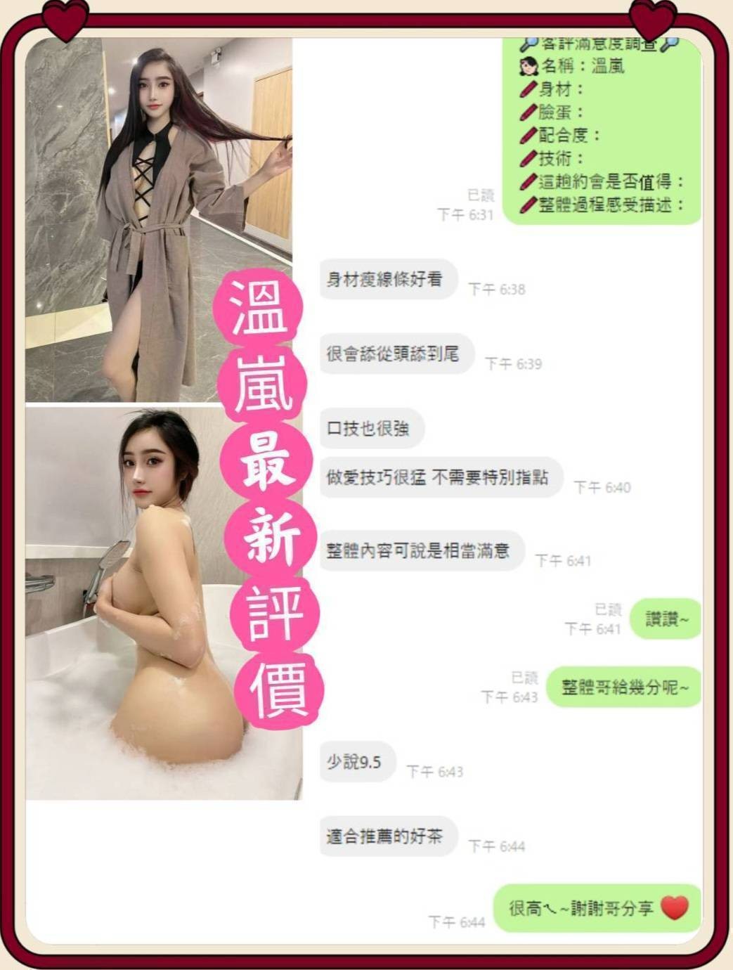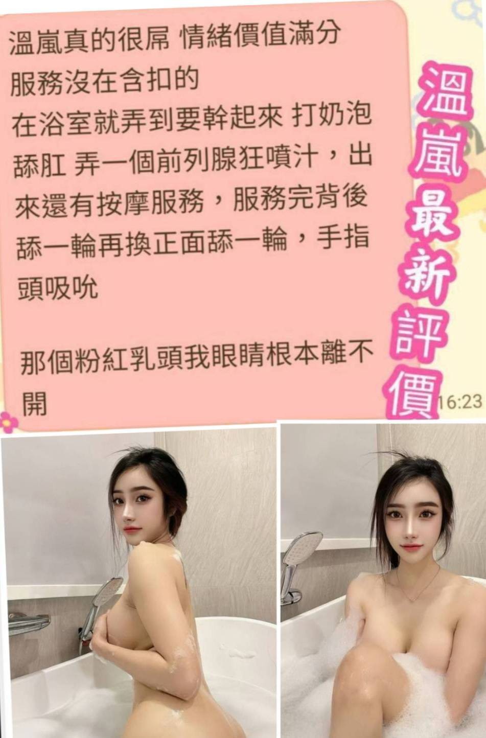 甜蜜共浴/殘廢澡/無套吹/舌吻/品鮑/69/按摩/乳交/奶炮/吞蛋舔睪丸/挑逗調情/舌尖舔滿全身/毒龍舔肛……
