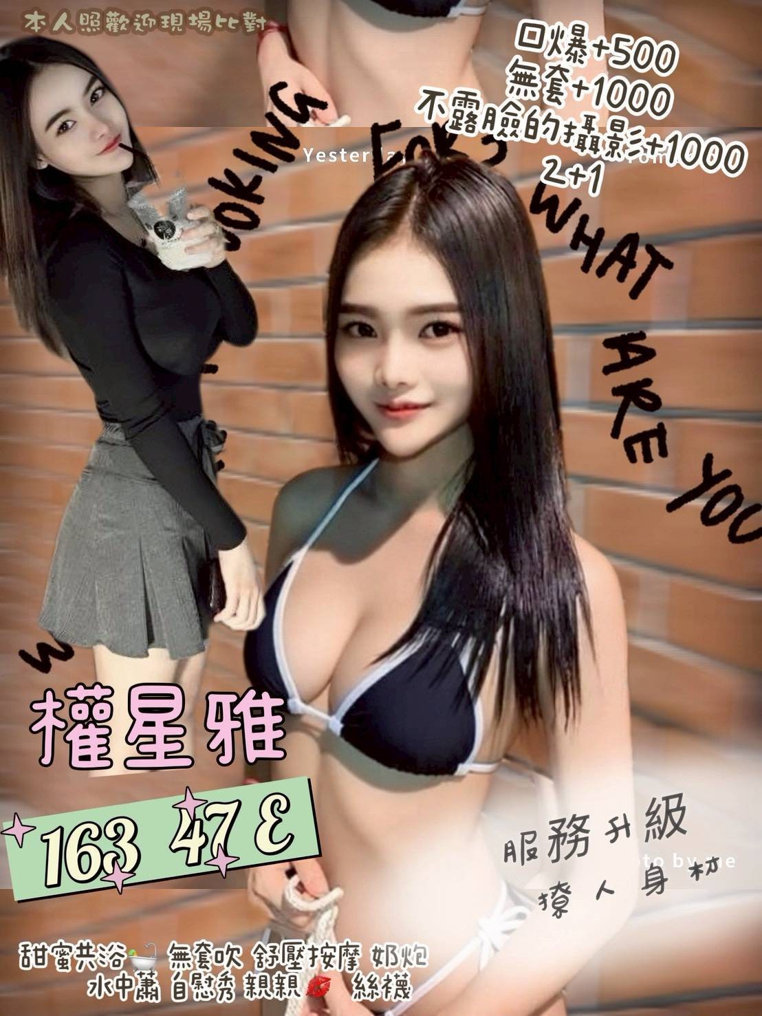 ☑️無套吹 ☑️Kiss☑️前後澡 ☑️按摩 ☑️奶炮☑️胸推 ☑️屁推☑️絲襪☑️水中蕭☑️自慰秀
